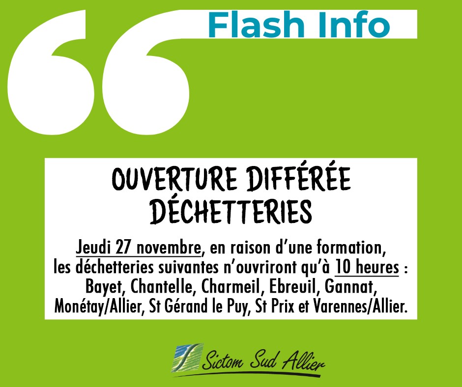 Le SICTOM Sud-Allier de Bayet vous informe que plusieurs déchèteries, dont celle de Charmeil, n'ouvriront qu'à 10 heures, le jeudi 27 novembre 2025.