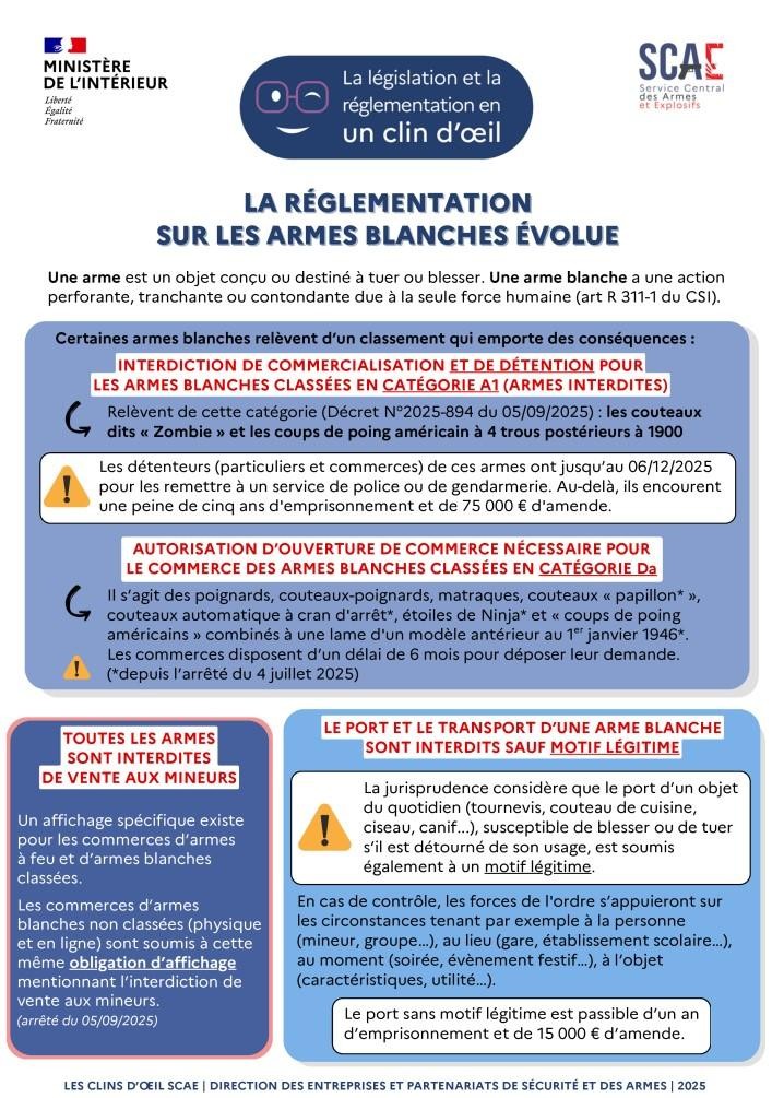 Les services de l'État vous informe que, dans un objectif de renforcement de la sécurité publique et de prévention des violences impliquant des armes blanches, la réglementation relative à leur vente, détention et port a été modifiée par l’arrêté du 4 juillet 2025 et le décret n° 2025-894 du 5 septembre 2025, à la suite du rapport de la mission « Mineurs et armes blanches » remis au Premier ministre le 28 mai 2025.