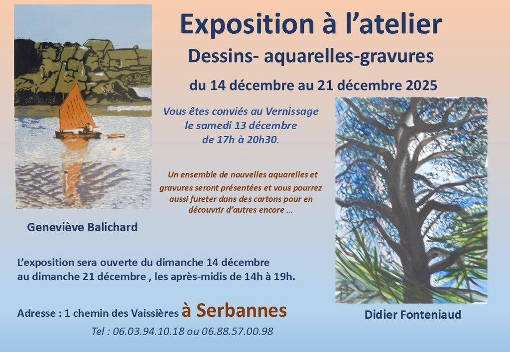 Geneviève et Didier seraient ravis de vous accueillir à l'atelier, soit pour le vernissage le samedi 13 décembre entre 17h et 20h30 soit un après midi entre le dimanche 14 décembre et le dimanche 21 décembre.
