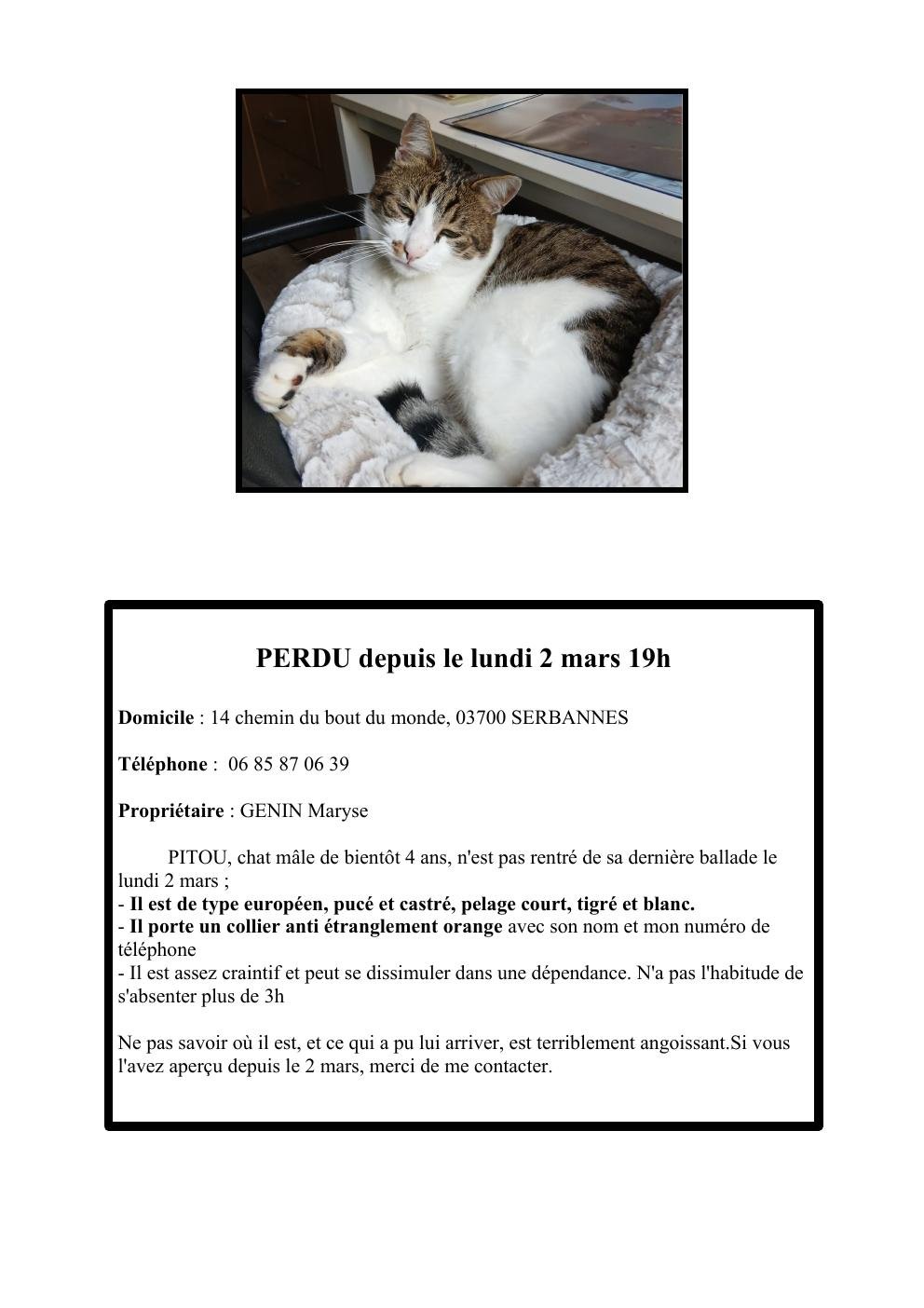 PITOU, chat mâle de bientôt 4 ans, n'est pas rentré de sa dernière ballade le lundi 2 mars ;